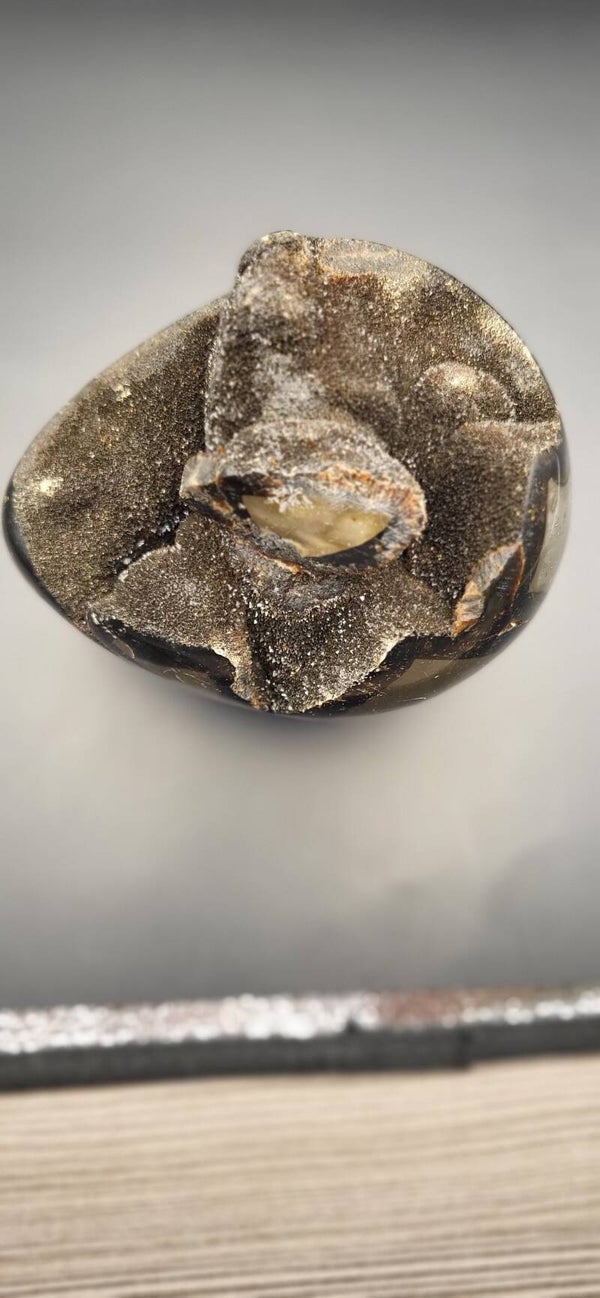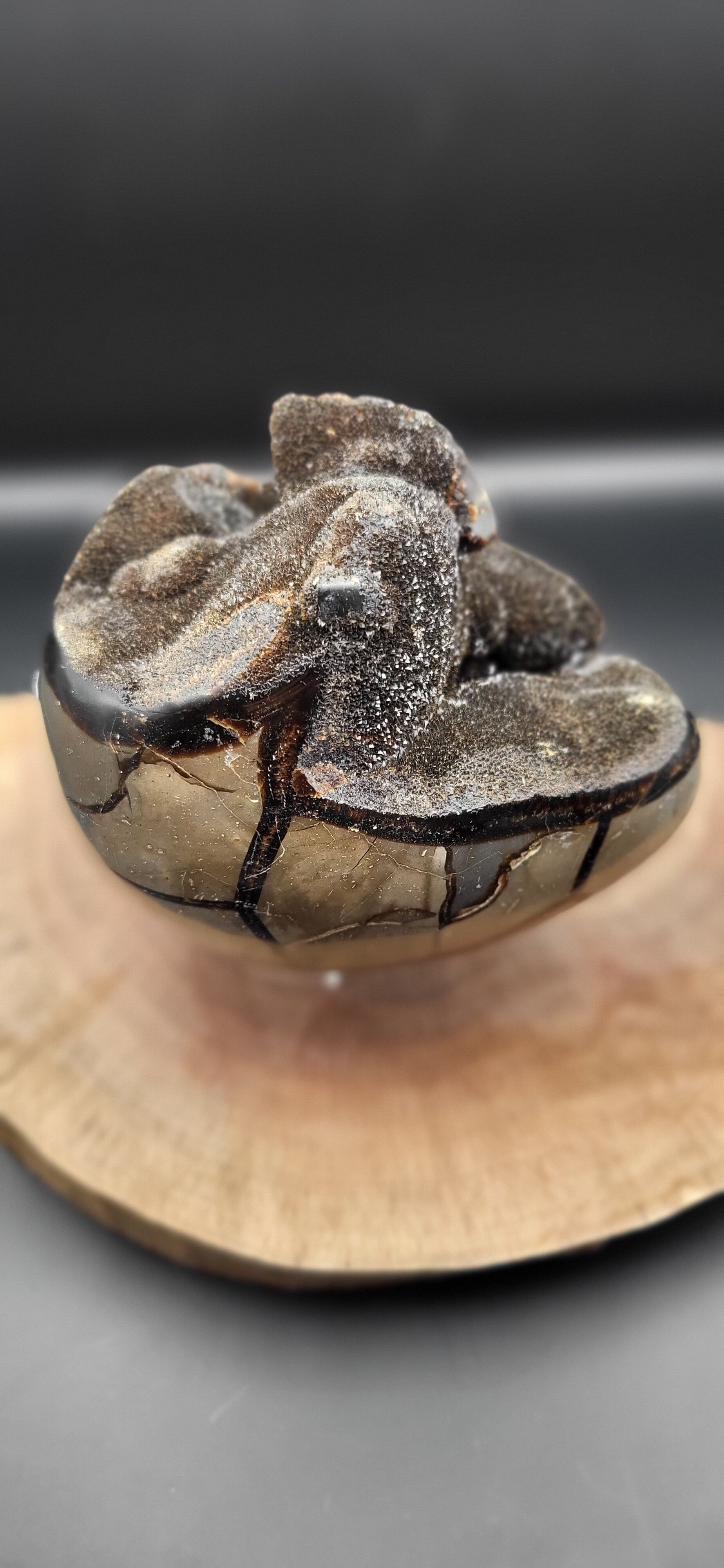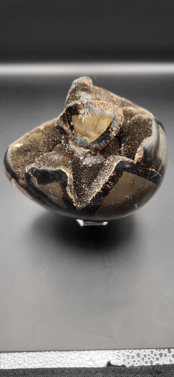 Eine Septarie (oft auch Septarien-Ei genannt, wenn sie in Eiform geschliffen oder poliert wurde) ist ein faszinierendes Gestein mit charakteristischer Zeichnung. Es besteht meist aus graubraunem Kalkstein oder Tonstein, durchzogen von rissartigen Adern aus Calcite, Aragonit oder seltener Pyrit.