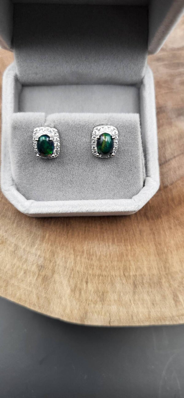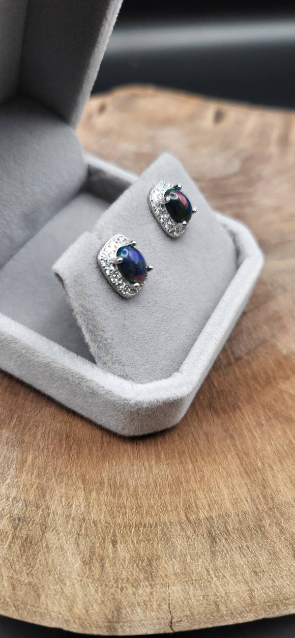Ohrstecker mit schwarzem Opal in Sterling-Silber – faszinierendes Farbspiel in edler Fassung. Jeder Stein schimmert individuell in Grün-, Blau- und Rottönen. Ein eleganter Blickfang für Tag und Abend.